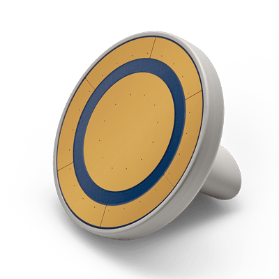 The outer surface is gold-plated (1 micron), offering high conductivity and biocompatibility. Energy transmission is proportional to the actual skin–electrode contact area, ensuring a safe and comfortable application.