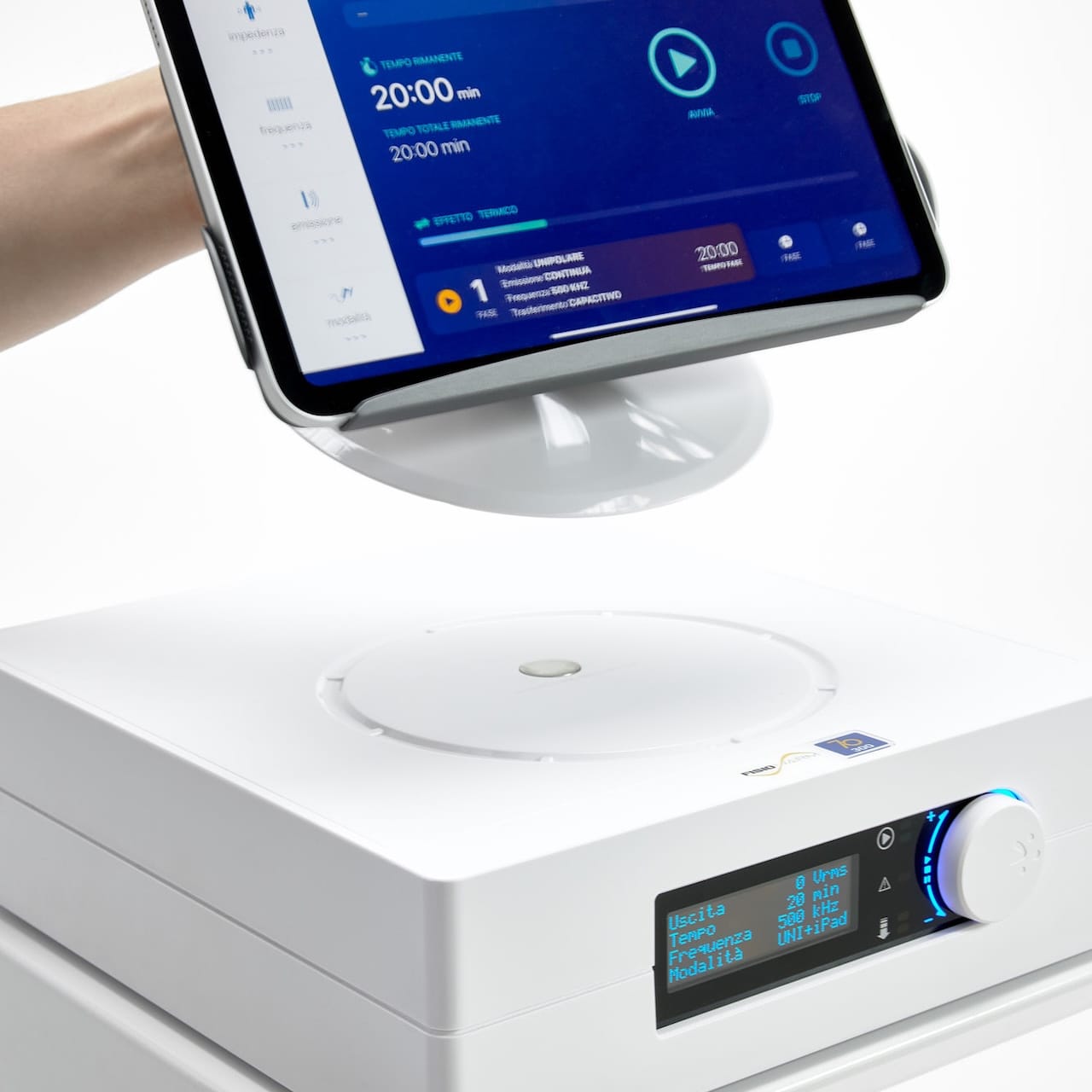 App Fisiowarm per iPad (incluso), Display OLED e codificatore rotativo con pulsante multi-funzione.