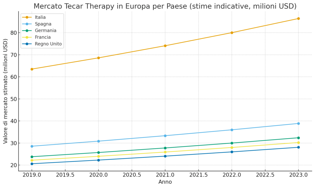 Negli ultimi anni il mercato europeo dei dispositivi per Tecarterapia ha registrato una crescita costante, trainata dall’aumento della domanda di trattamenti non invasivi per disturbi muscolo-scheletrici e dal ruolo sempre più rilevante della riabilitazione fisioterapica.